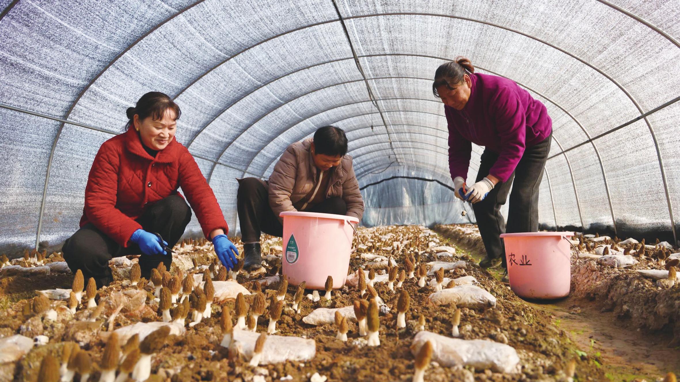 近日,鸣凤镇汪家村水肥一体化温室大棚与花园村标准化菇棚内,一朵朵羊肚菌破土而出撑起“小伞”,进入集中采摘期。