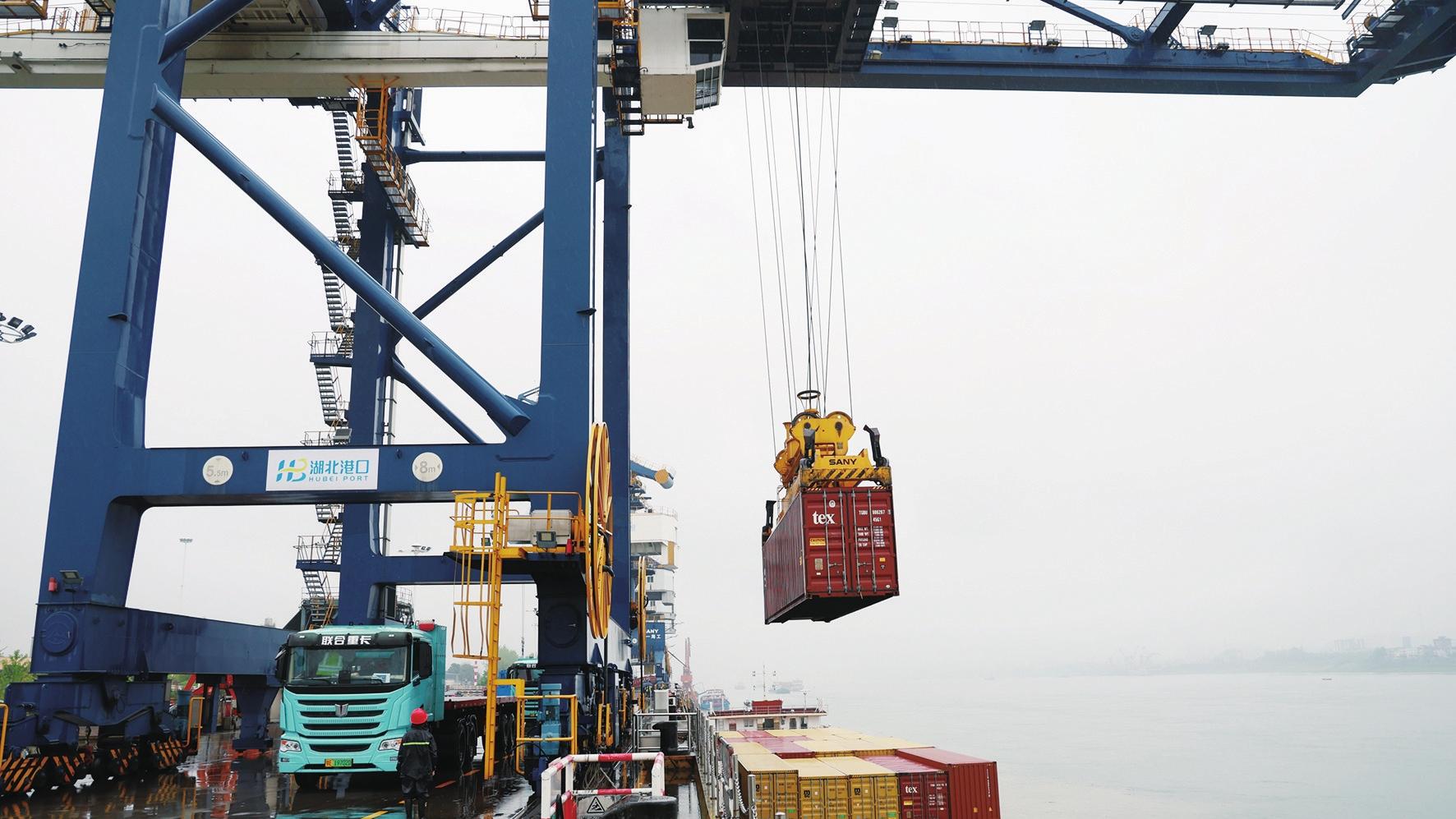 4月9日,宜都港红花套作业区,工人正忙着将集装箱吊运装车,运往坝上秭归港装船。