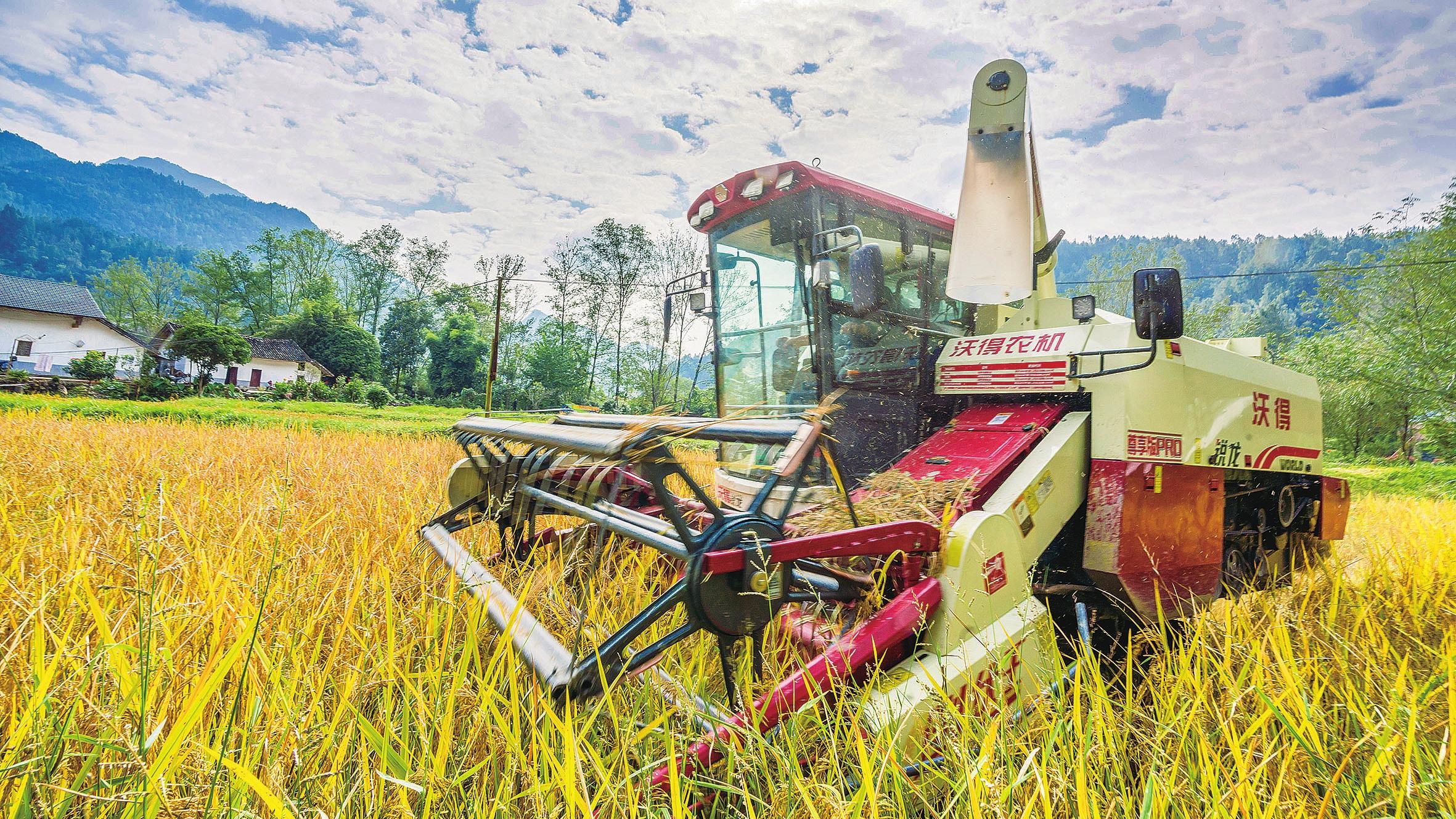 10月23日,秭归县九畹溪镇石柱村的550亩梯田稻浪翻滚,满目金黄,联合收割机在田垄间来回穿梭,轰鸣声响彻田野。