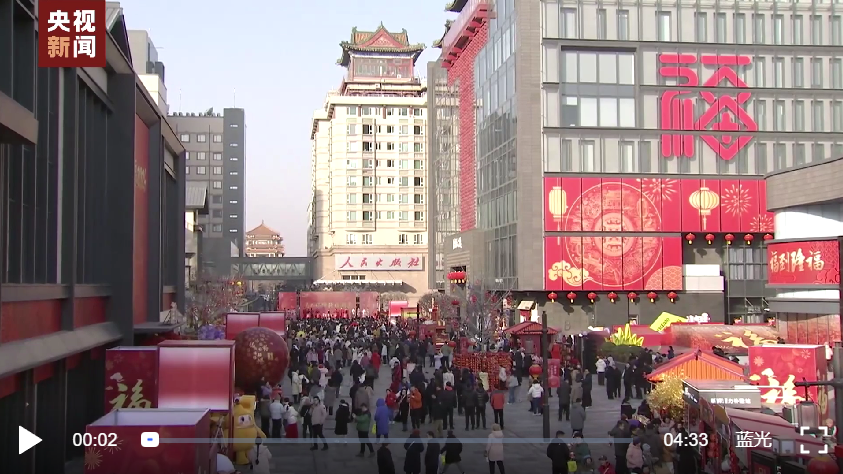 春节期间,北京隆福寺街道上,京西太平鼓表演欢快热闹。