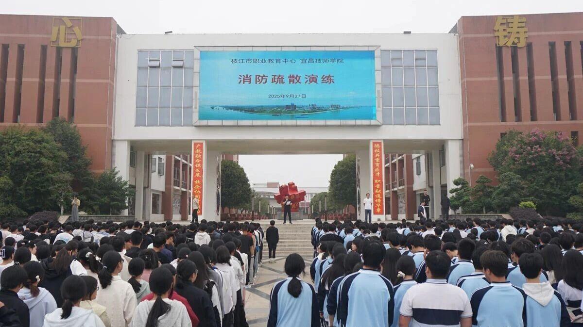 9月27日大课间,枝江职教中心组织全体师生开展消防疏散演练,模拟火灾应急逃生全过程。