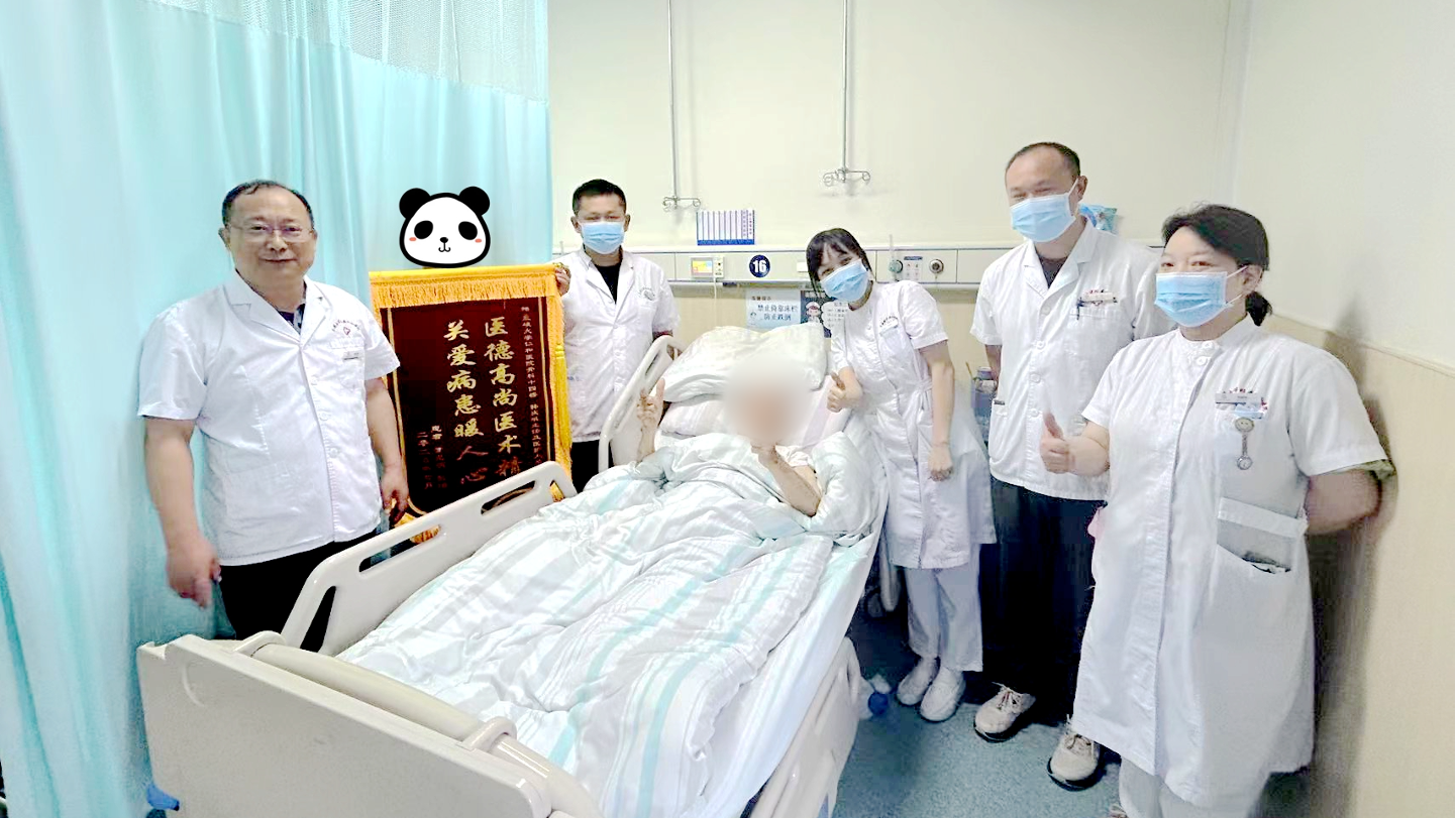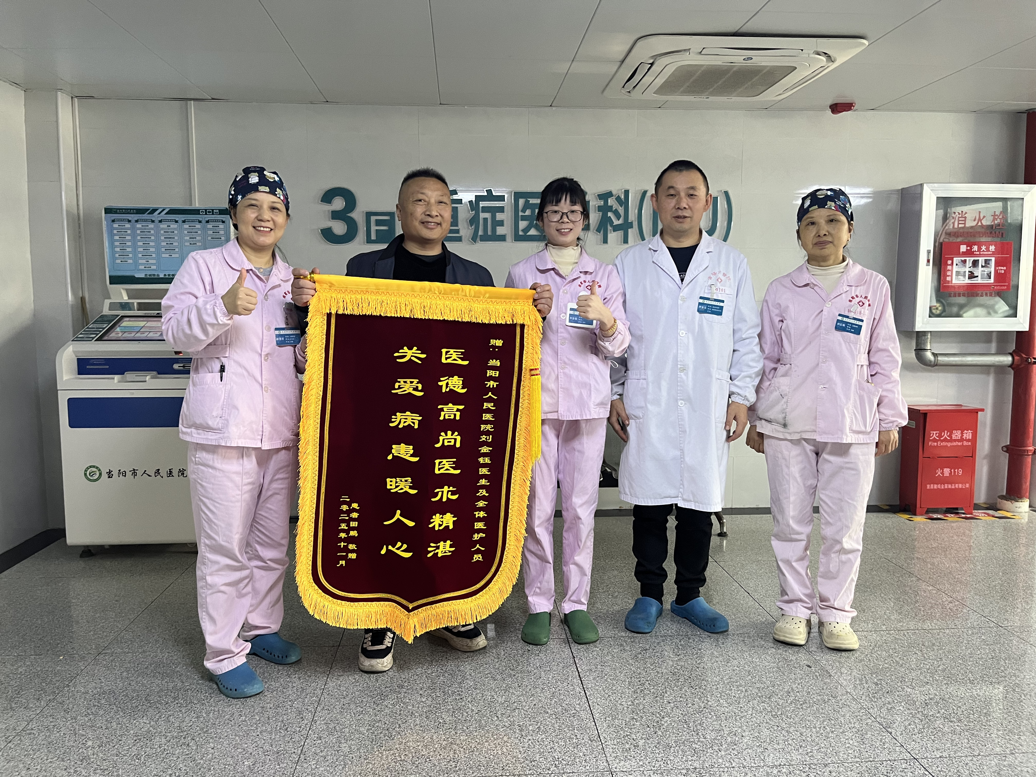 11月5日,当阳市人民医院重症医学科候诊区上演了温馨一幕,48岁的田先生手捧鲜花,在亲友的陪伴下,将一面锦旗郑重交到主治医生刘金钰手中。