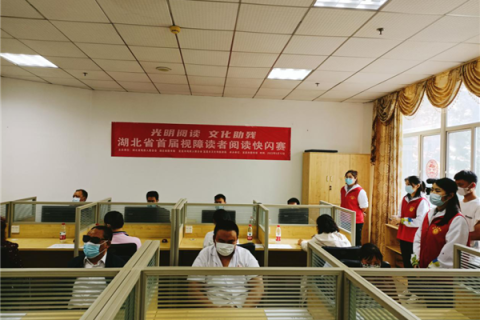 5月12日,在第32个全国助残日来临之际,湖北省首届视障读者阅读快闪赛在宜昌市图书馆一楼盲人阅览室举行。