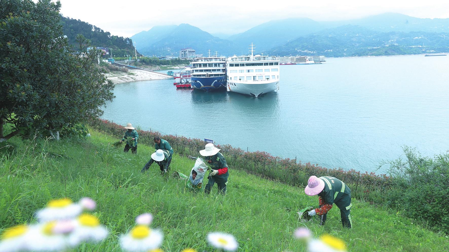 4月22日,在三峡库区秭归县木鱼岛天问公园,环保志愿者在库区岸线上清理杂草垃圾。