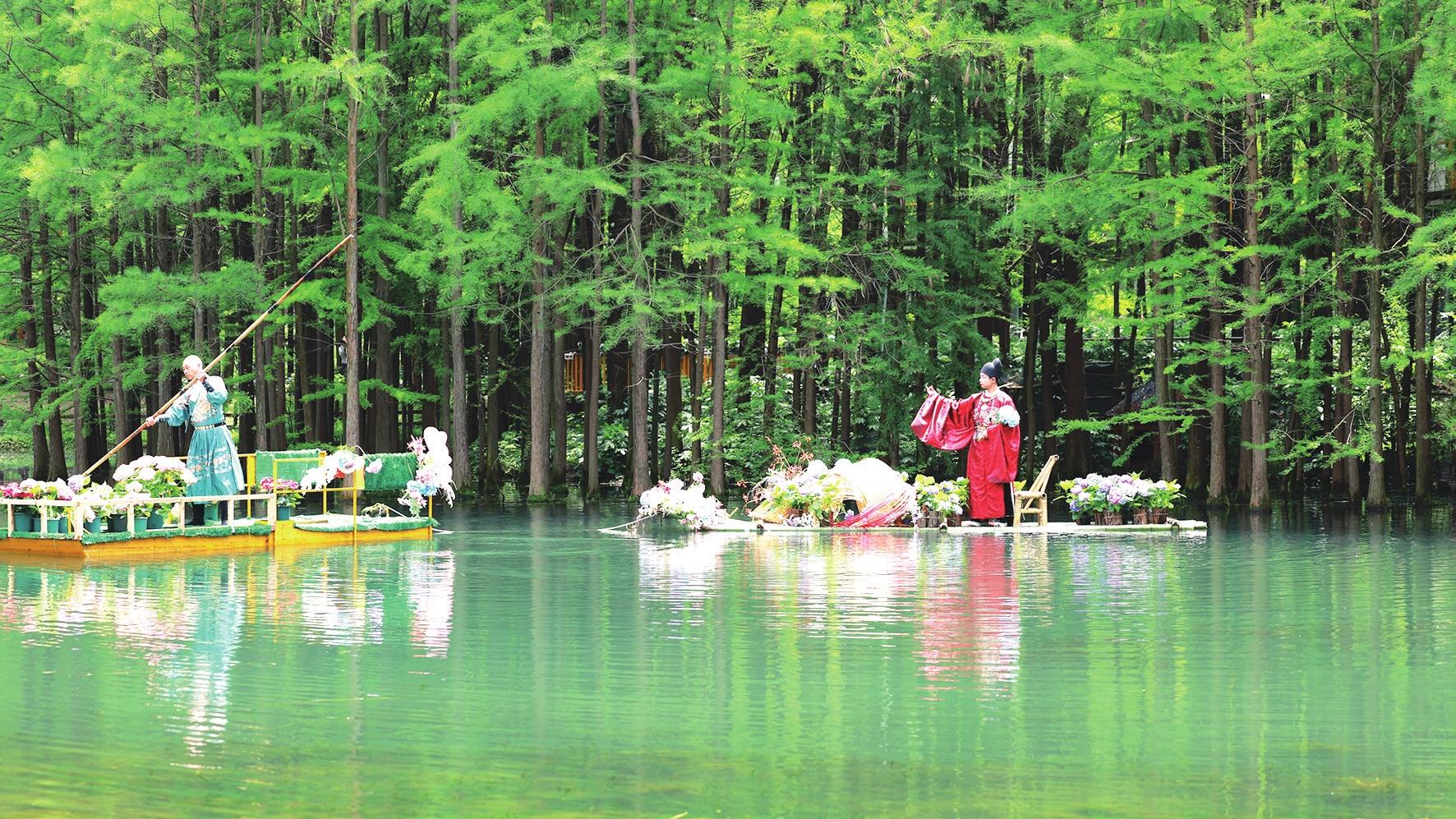 4月22日,宜昌城区运河公园,一位汉服爱好者乘花船在湖面巡游,吸引许多游客驻足拍照。