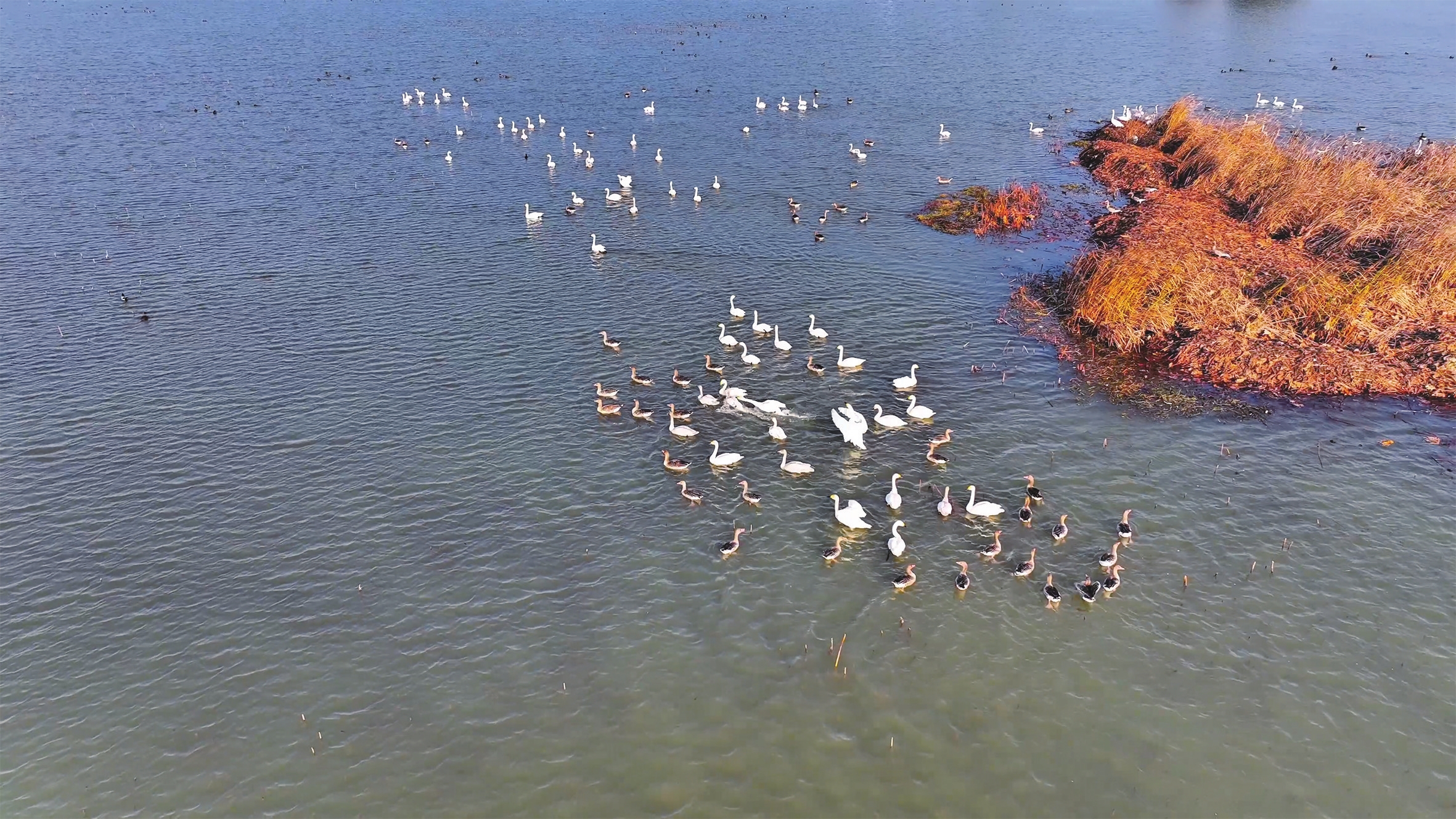进入冬季,位于当阳的季家湖国家湿地公园迎来了小天鹅、白鹤、灰雁、凤头潜鸭等候鸟,这片2340亩的水域成了灵动的“天鹅湖”。