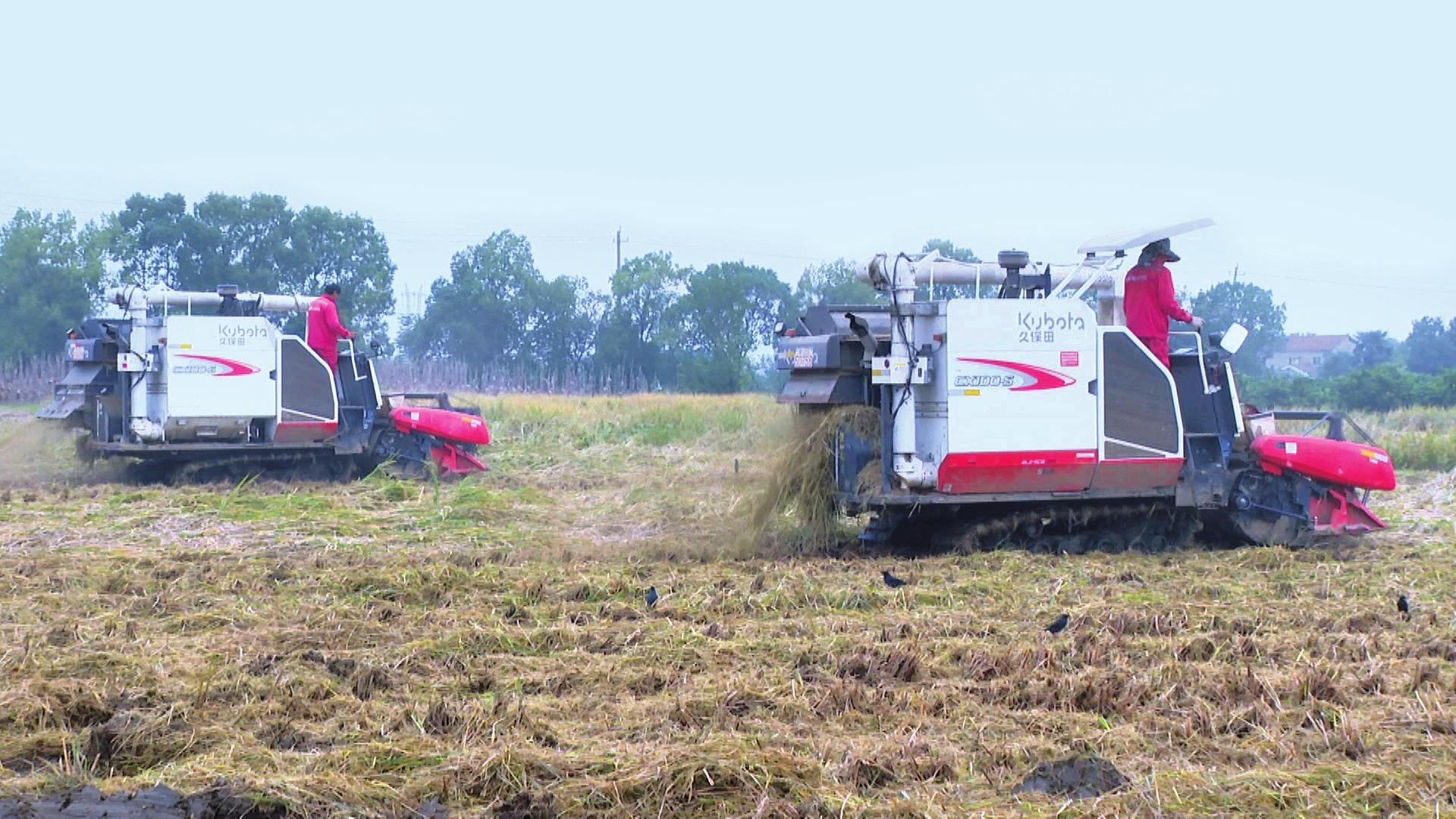 10月27日,枝江市安福寺镇桑树河村的田埂上,泥泞不堪。五家畈农机专业合作社的两台联合收割机正开足马力,在田间抢收每一穗成熟的稻谷。