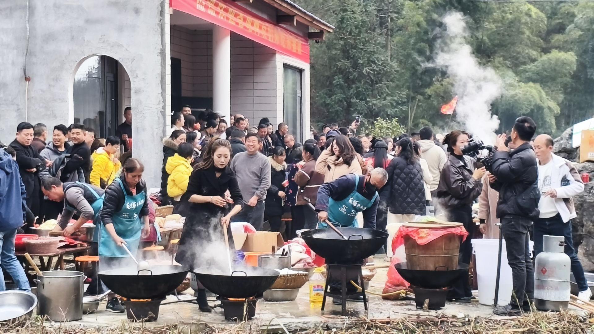 ​1月16日,崇阳县港口乡北山村北山岩下的山沟里,灶火通红、人声鼎沸。养猪户金本茂家屋前屋后、坡上坡下,摆开了连绵的席面。