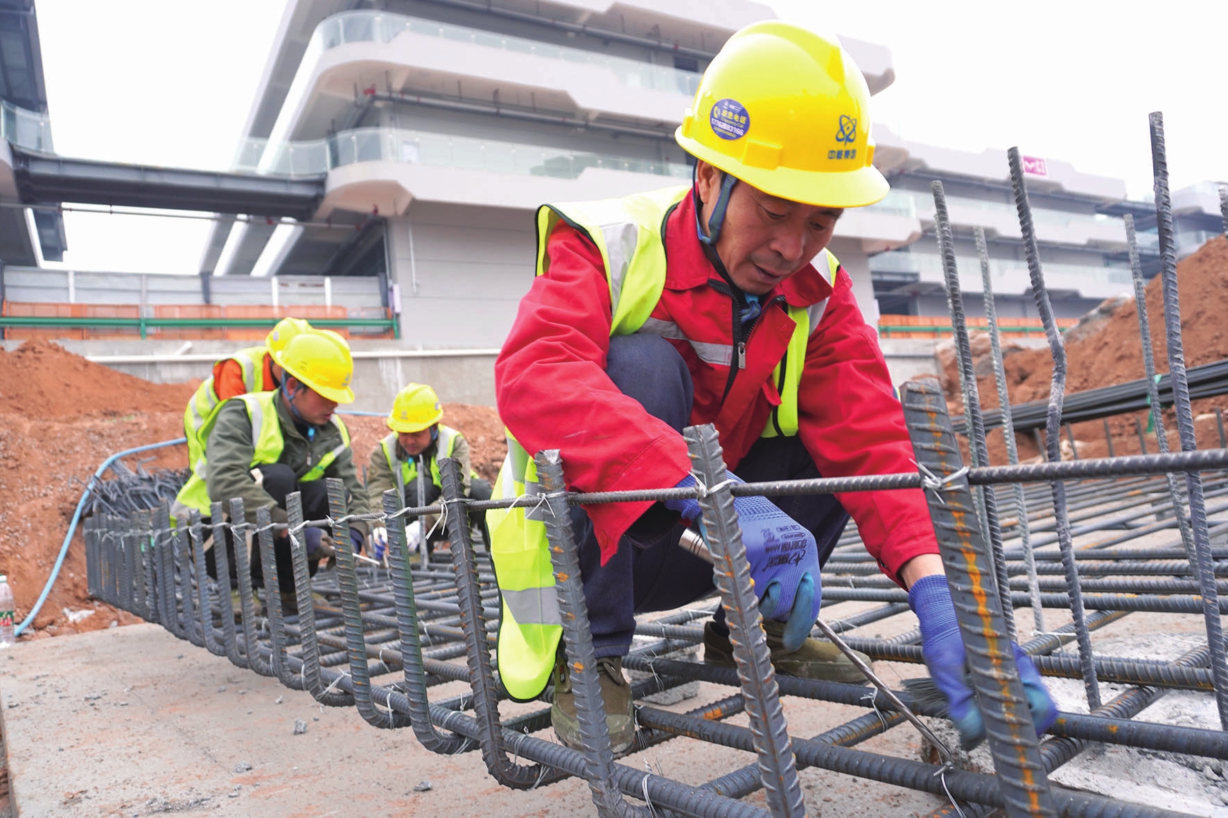 图为中燃总部大楼施工现场,工人们正在进行塔吊基础钢筋的捆扎。记者孙玉敏 摄