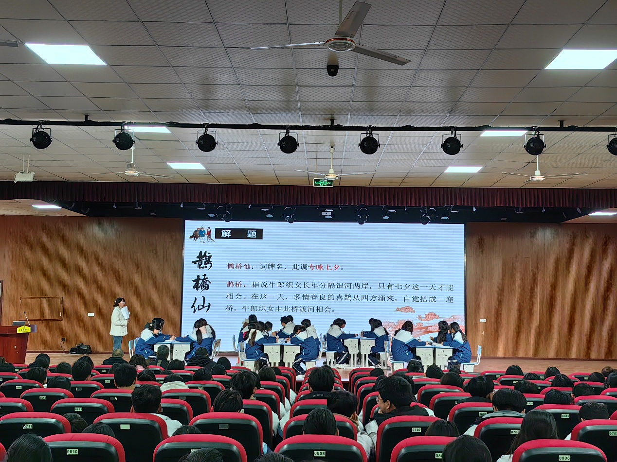 语文课堂中,罗芙蓉老师以《鹊桥仙》为载体,通过赏析“金风玉露一相逢,便胜却人间无数”、 “两情若是久长时,又岂在朝朝暮暮”这字字珠玑、落地若金石声的警策之语,引导学生感悟词人豁达的爱情观与哲思,聚焦"金风玉露""朝朝暮暮"等经典意象,借助小组研讨等教学手段,在诗词鉴赏中实现文学审美与人生哲理的深度共鸣,提升文学素养的同时增强文化自信。