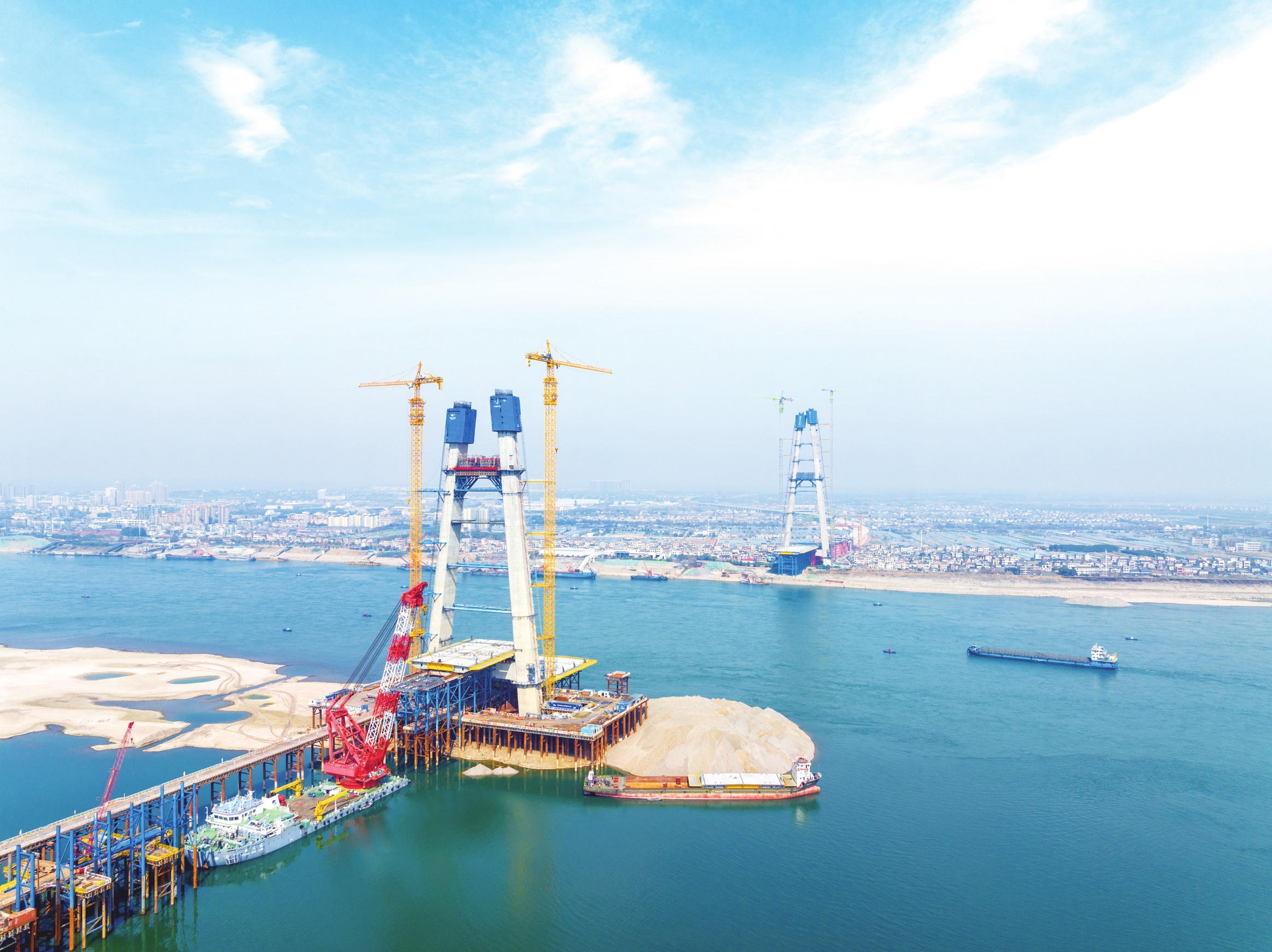 日前,枝江百里洲长江大桥建设现场一片繁忙,建设单位采取“白加黑24小时轮班制”加快建设进度,大桥北塔设计高度241米,主塔左幅已经达到了231米,右幅达到了223米,按照施工进度,主塔将在今年3月实现封顶。该大桥是当枝松高速公路的控制性工程,采用A型桥塔,主桥全长1549米,主跨890米,双向六车道。(通讯员王耿 摄)