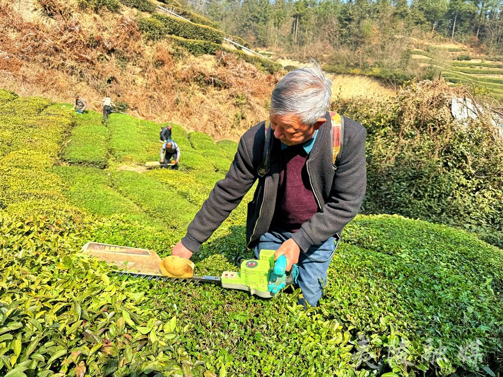 为了保证春茶的品质,服务队修剪得特别仔细。“第一要轻修剪,不能剪重了,剪重了会影响今年茶叶的芽头生长;第二要保持茶叶修剪平整,不然会影响茶叶的采摘质量。”对于茶叶修剪,邓村坪村民、同时也是服务队队员的胡学文颇有心得。