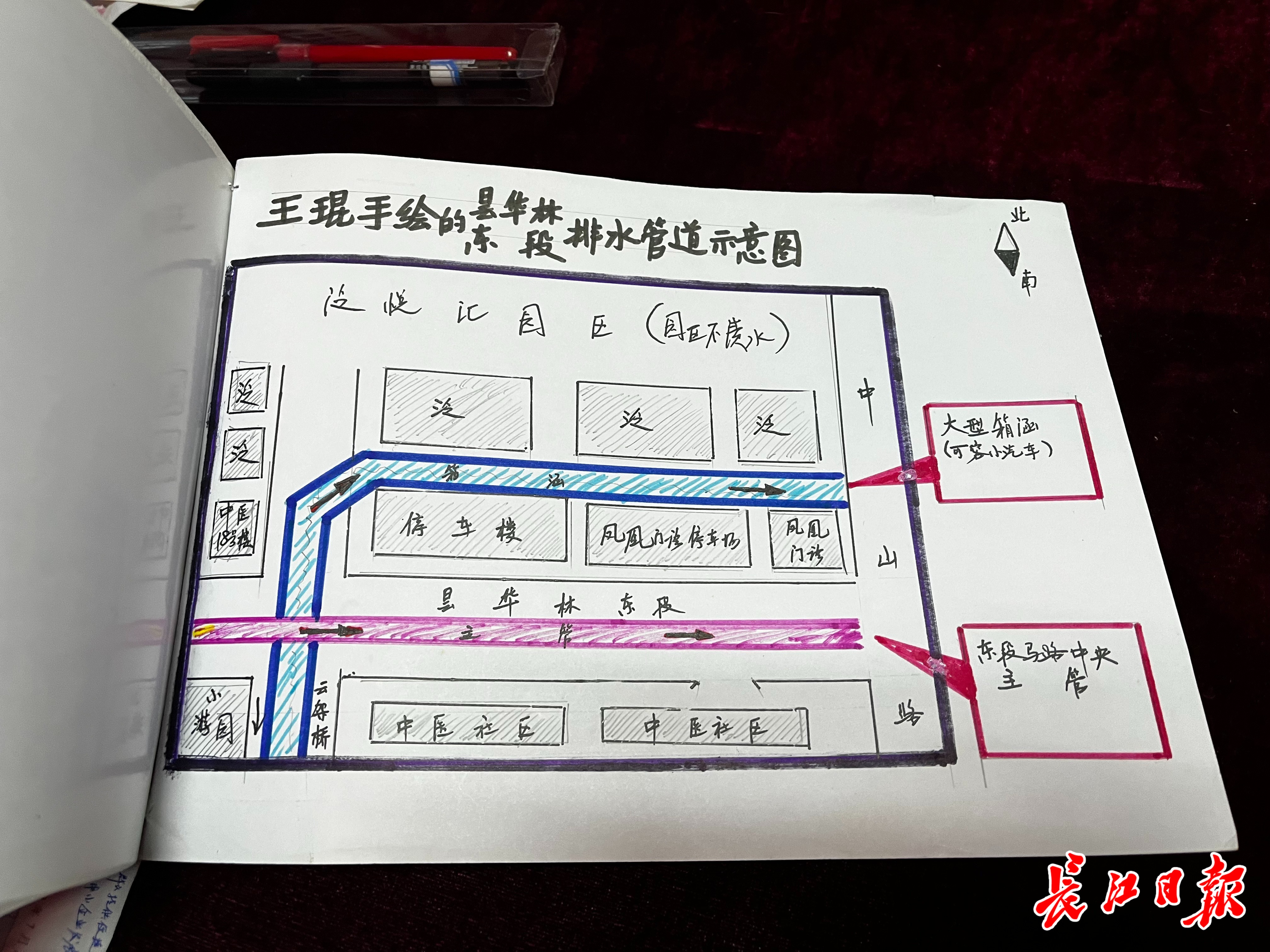 这份建议除了描述社区淹水导致居民生活不便,还附上了一张手绘的彩色排水施工图。图上清晰标明,中医社区积水是因为昙华林正街路中央排水不畅,而社区对面靠近泛悦汇商圈地下有一个箱涵,中医社区可借助这个箱涵解决水患。