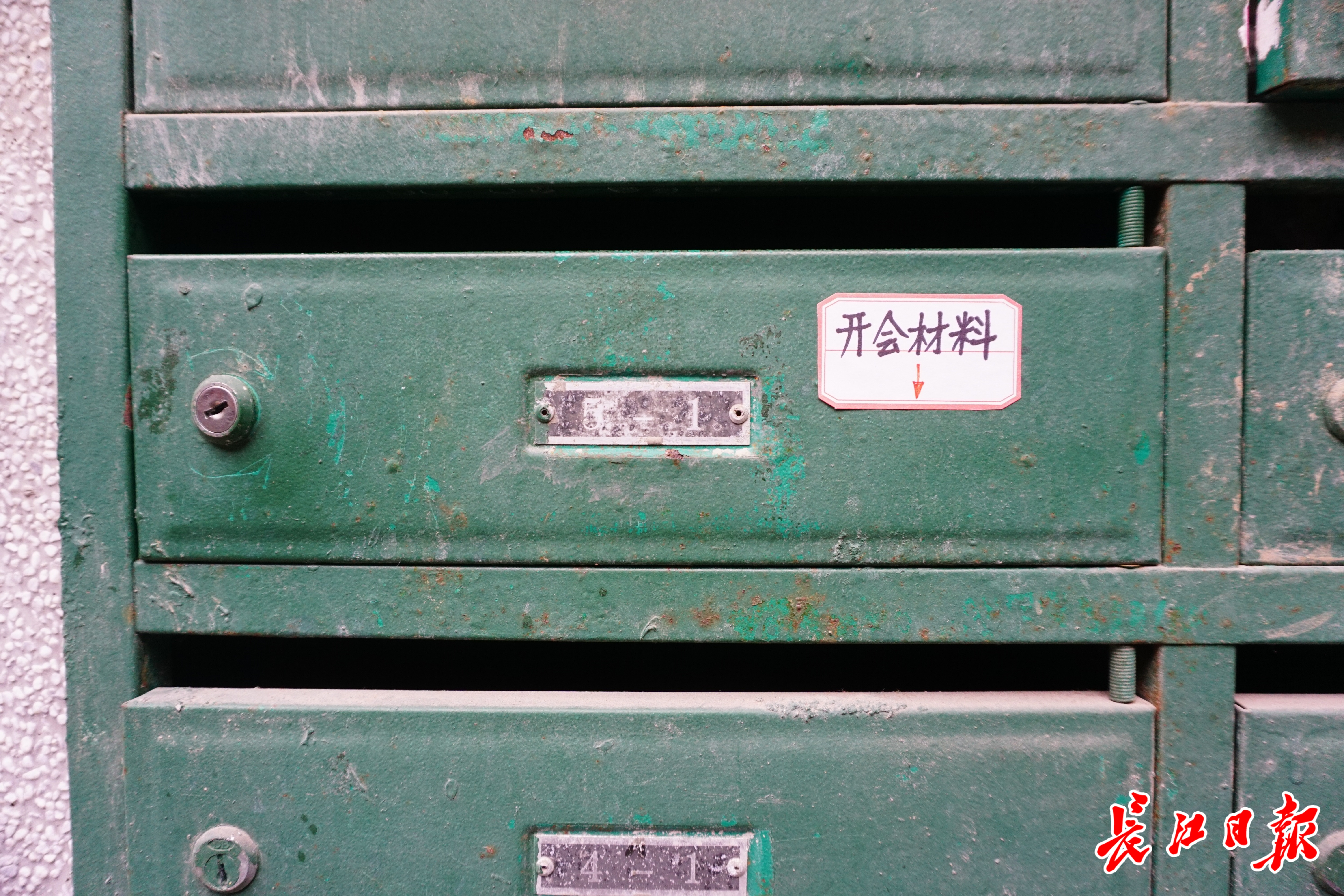 武汉市武昌区粮道街道中医社区,1栋1单元门洞口装有一排已脱漆的绿色信箱,其中一个箱门上贴着一张白色标签,上面写有“开会材料”四个字。