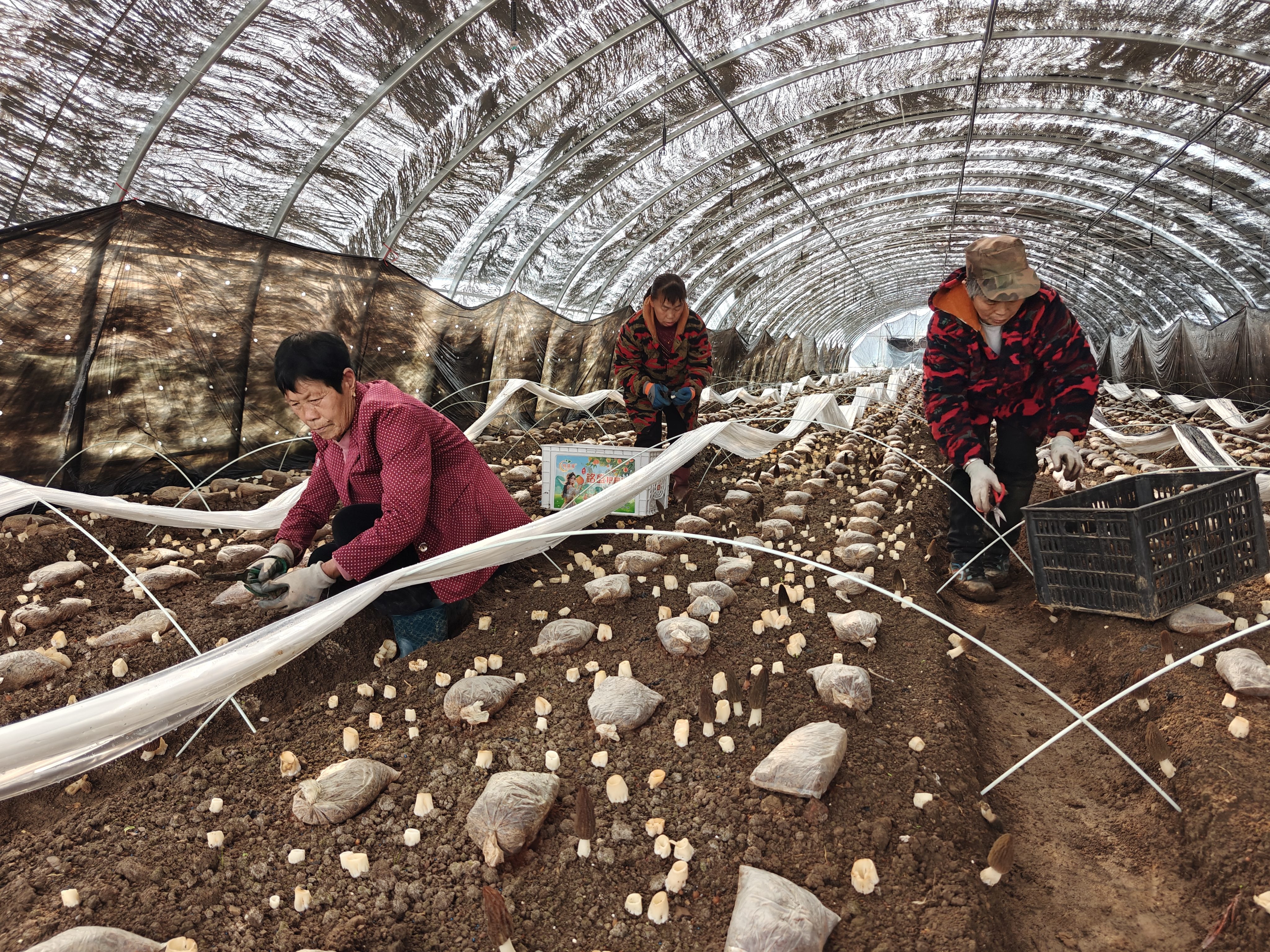 走进基地,工人们正熟练地采摘羊肚菌,从挑选到搬运,每一步都井然有序,确保新鲜产品迅速送达消费者餐桌。