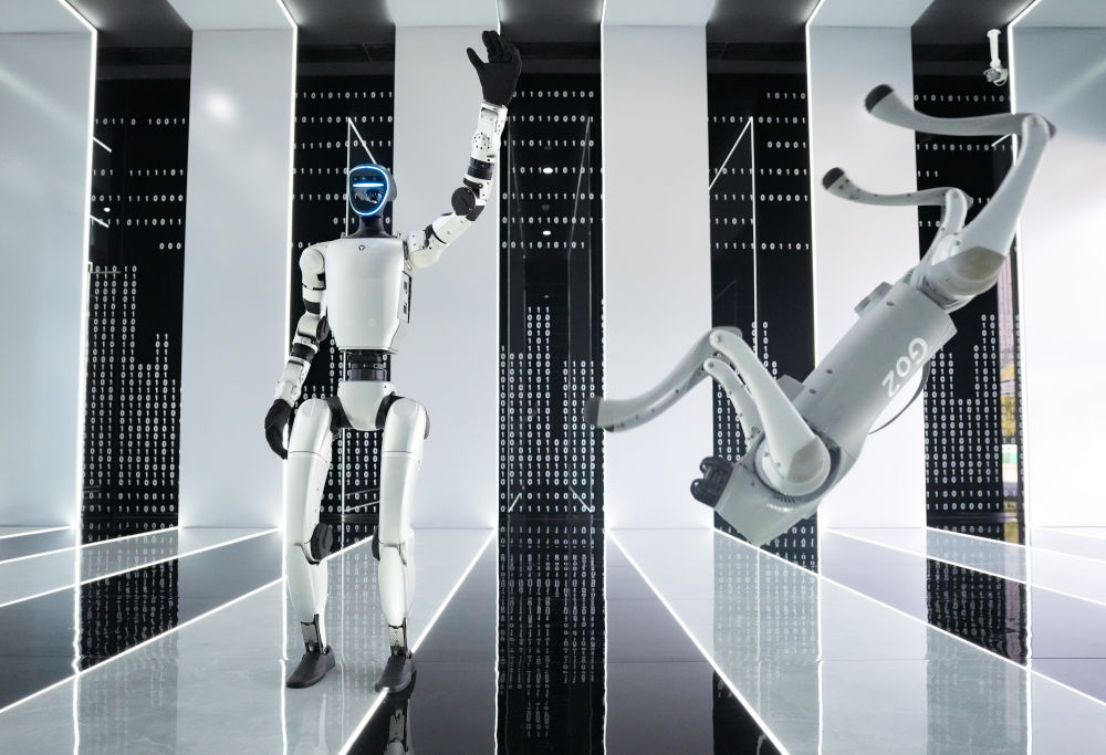 2025年3月1日,在杭州宇树科技有限公司的产品展示中心,人形机器人和四足机器人在工作人员控制下做动作。人形机器人是人工智能技术的集成体现,在这个未来产业的重要赛道上,一大批中国企业深耕技术、持续创新,国产机器人正在跑出“加速度”。