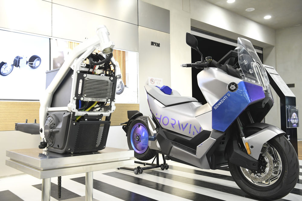 这是在江苏常州浩万新能源科技有限公司展厅拍摄的一款电动摩托车(2024年6月1日)。该公司初创于2016年,是一家主打海外市场的智能电动摩托车生产商,产品销往100多个国家和地区,拥有200多项核心技术专利。近年来,常州着力打造“新能源之都”,从政策、人才等方面提供支持,助力新能源民营企业“走出去”。