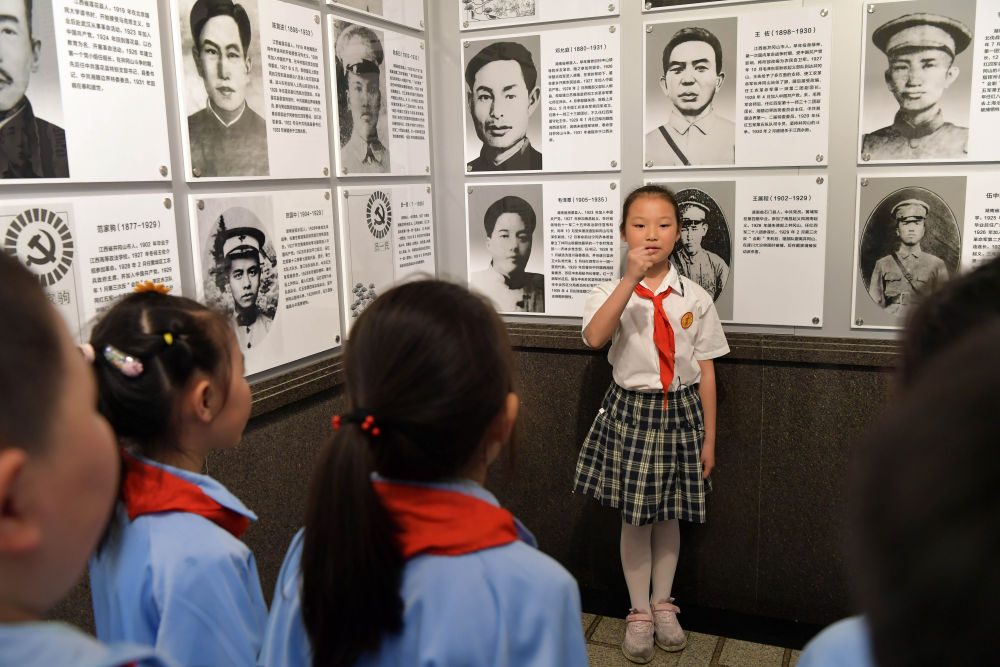 2021年5月12日,在井冈山革命烈士陵园,“小红军宣讲团”的成员周煜菡给前来参观研学的学生们进行义务讲解。井冈山小学把“红色德育”作为立德树人的重要抓手,成立了“小红军宣讲团”,培养了一批讲好红色故事、传承先辈精神的小小义务讲解员。