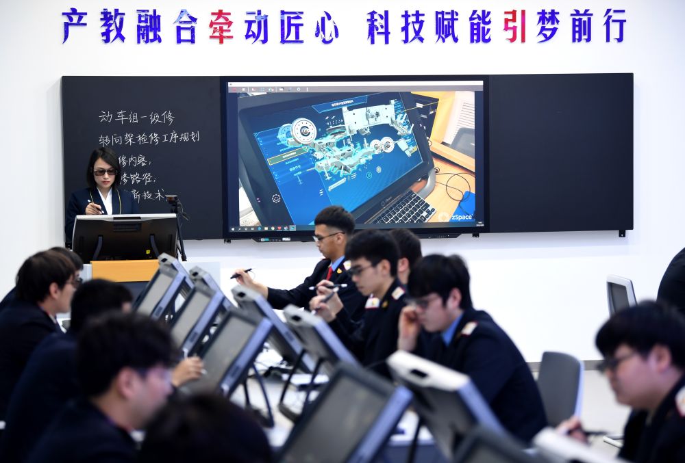 2022年4月29日,在西安铁路职业技术学院,学生在动车组VR智慧课堂上模拟检修。近年来,我国着力促进教育公平,提升教育质量,加快推进教育现代化,教育数字化工作持续推进、成果丰硕。