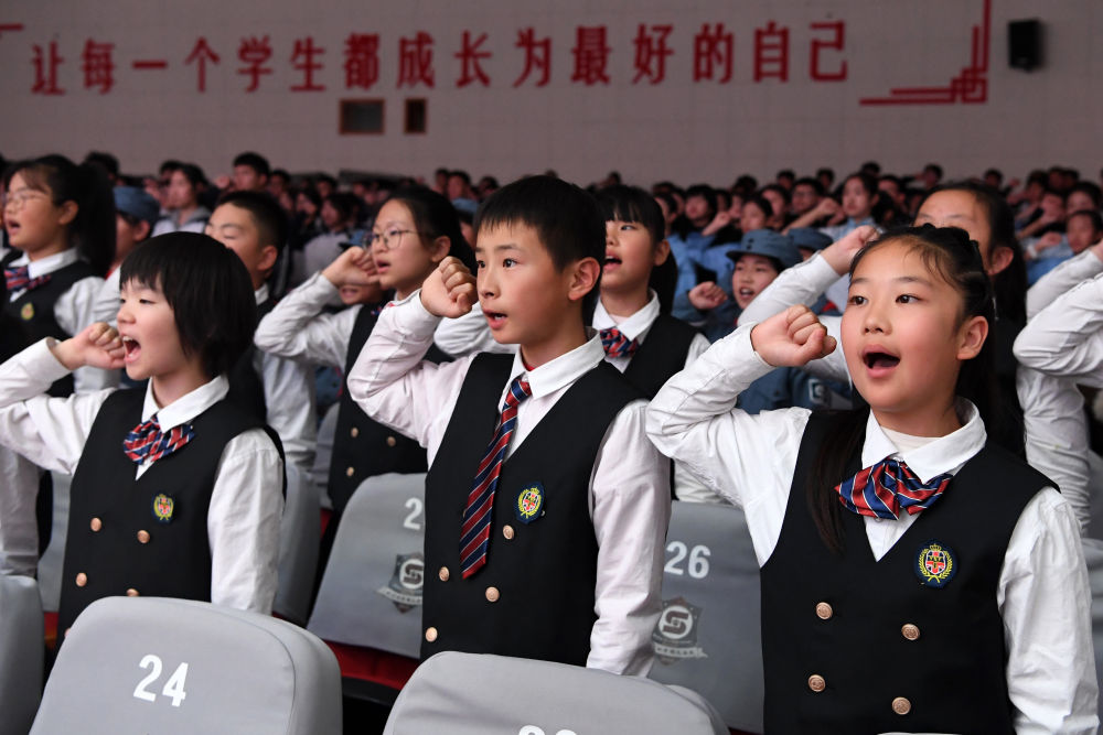 2024年11月13日,在“中流砥柱——中国共产党抗战文物展校园巡展”活动上,北京市第四中学顺义分校学生们共同宣誓,传承红色基因,接受爱国主义教育。该巡展把中国人民抗日战争纪念馆的馆藏资源搬进北京中小学校园,打造流动博物馆和红色思政课堂。