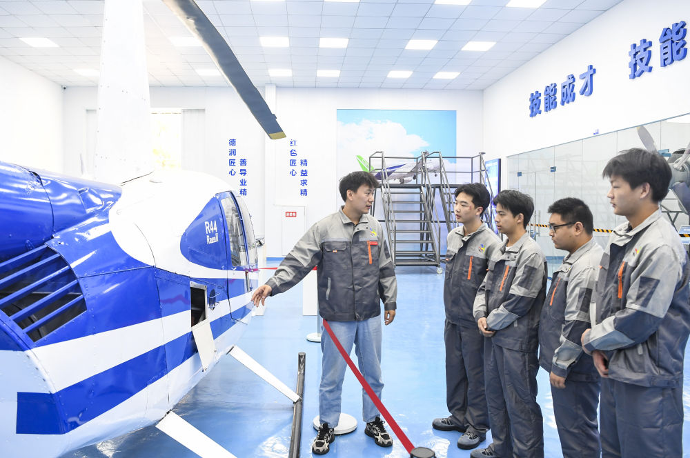 2024年9月25日,重庆城市职业学院航空学院教师(左一)在为学生们讲解直升机绕机检查的注意事项。近年来,重庆市永川区依托现代制造业基地和西部职教基地优势,推动低空产业领域的校企合作、产教融合,布局发展低空制造、低空管理、低空应用等低空经济产业,助推经济高质量发展。