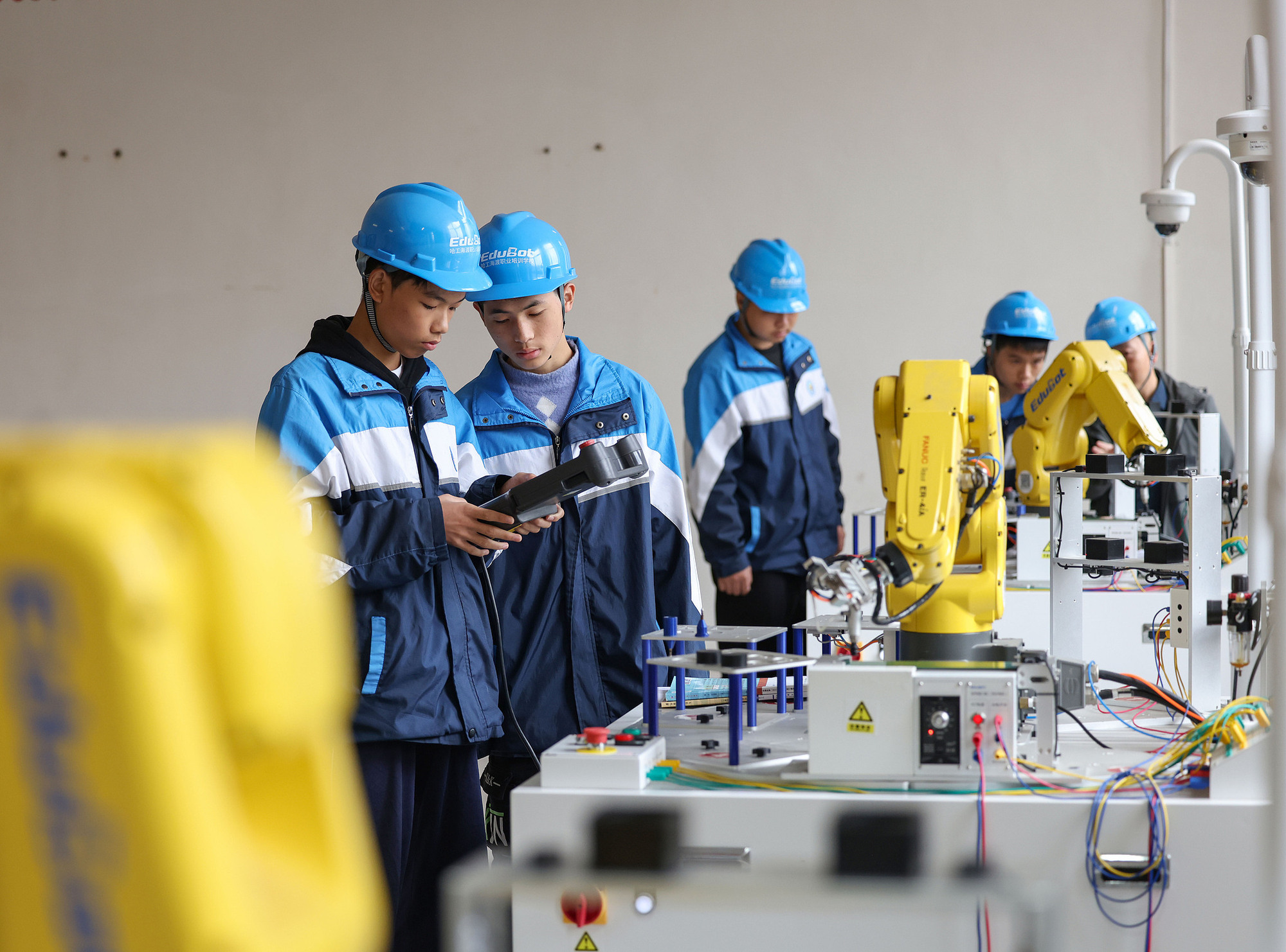 职业学校的学生在进行工业机器人实操