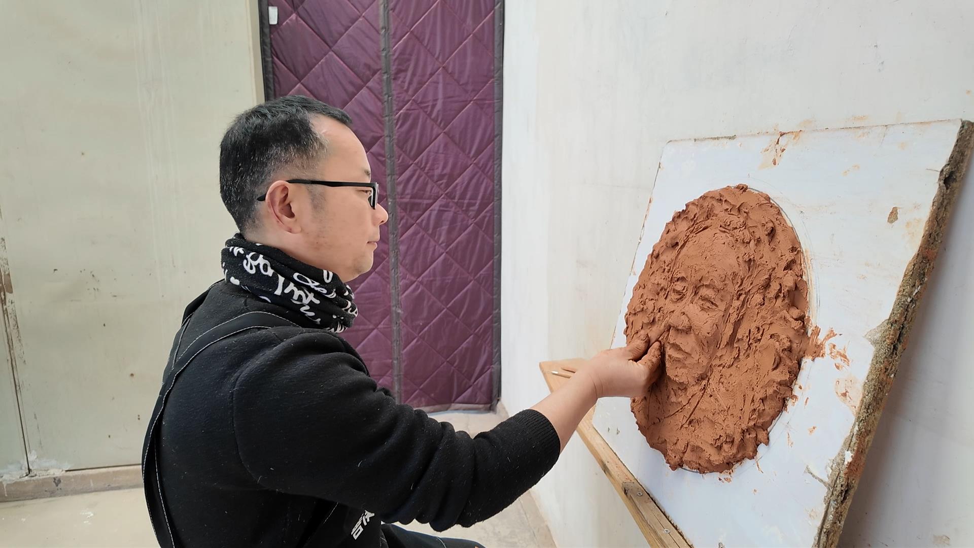 揉好泥后,廖喜焱将泥巴摊平在一块木板上,开始着手创作泥塑作品。他告诉记者,今天要做的是一座人物头像浮雕。泥塑的塑形环节无须复杂模具,全凭创作者的双手。只见他用手指勾勒出人物头部的大致轮廓,确定额头、脸颊、下巴的位置。手法看似随意,却精准地把控着比例。
