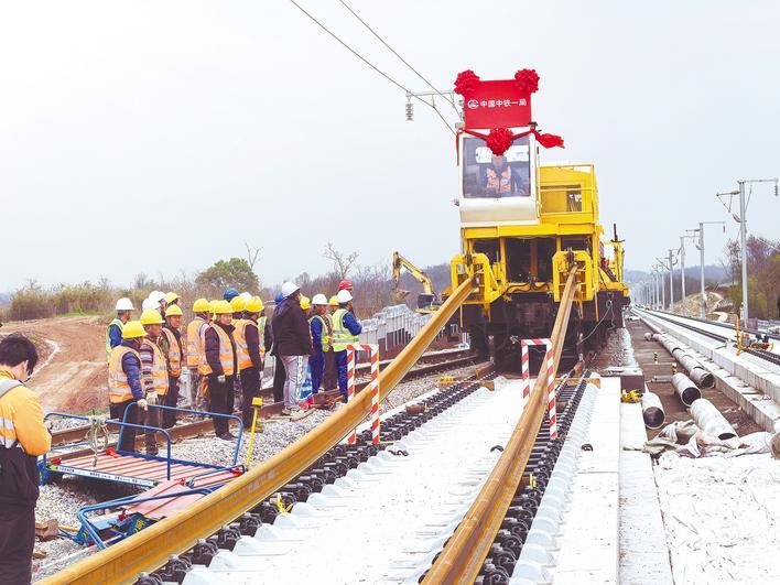 襄荆高铁开始铺轨。图为推动车正在铺轨。(湖北日报全媒记者胡祎摄)